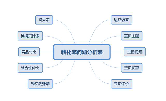 按照我日常分析宝贝情况时候的思路,总结了个转化问题分析表。宝贝的转化迟迟起不来,从这几个方面去找原因: